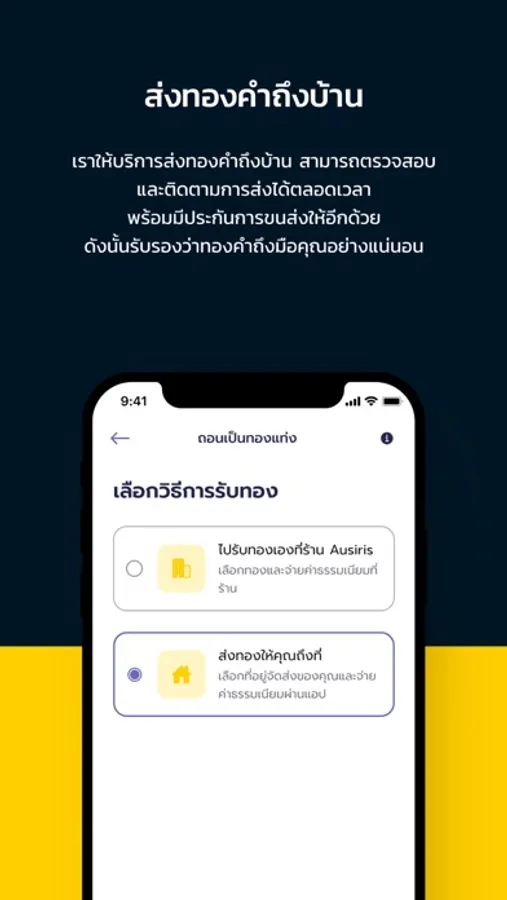 "รับแท่งทองส่งถึงหน้าประตูบ้านคุณ หรือจะไปรับทองคำที่ร้านค้าพันธมิตรของเราก็ได้"