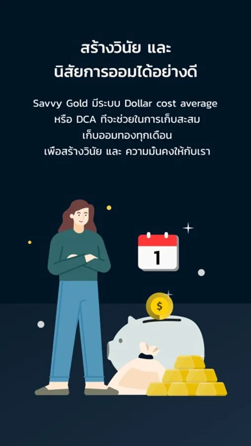 Savvy Gold มีระบบ Dollar cost average หรือ DCA ที่จะช่วยในการเก็บสะสม เก็บออมทองทุกเดือน เพื่อสร้างวินัย และ ความมั่นคงให้กับเราในอนาคต หรือจะส่งต่อให้ลูกหลาน คนที่เรารัก็สามารถทำได้อย่างง่ายดาย มาเริ่มต้นออมทองคำที่ปลอดภัยที่สุดกันเถอะ !!