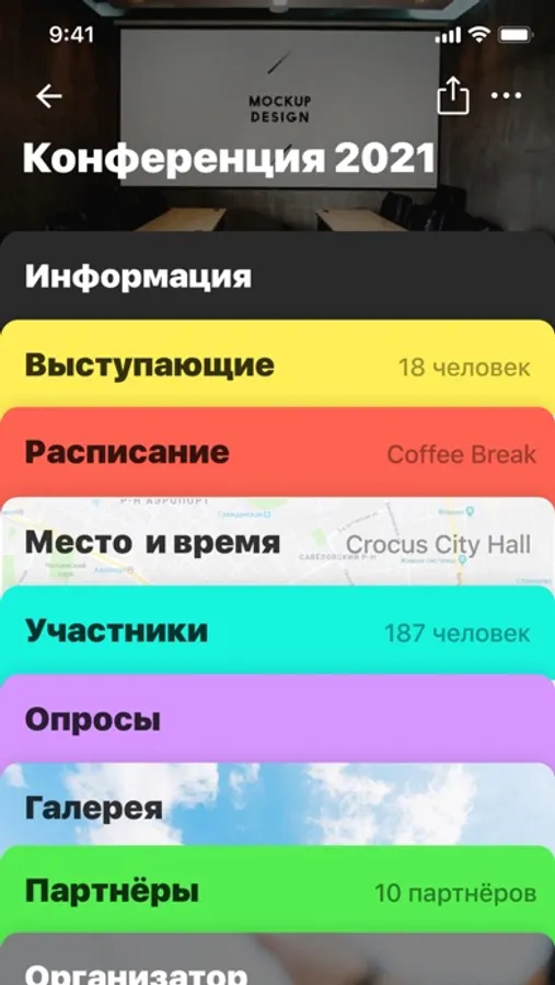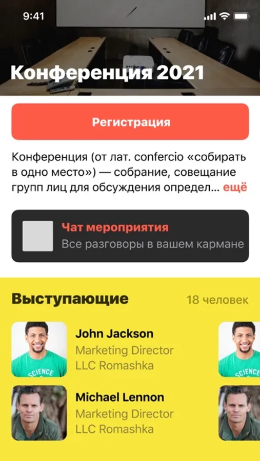 • Найти чаты, расписания, опросы, фотографии для каждого мероприятия