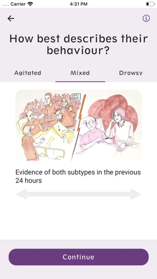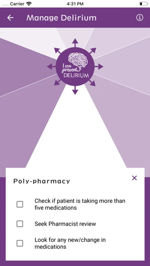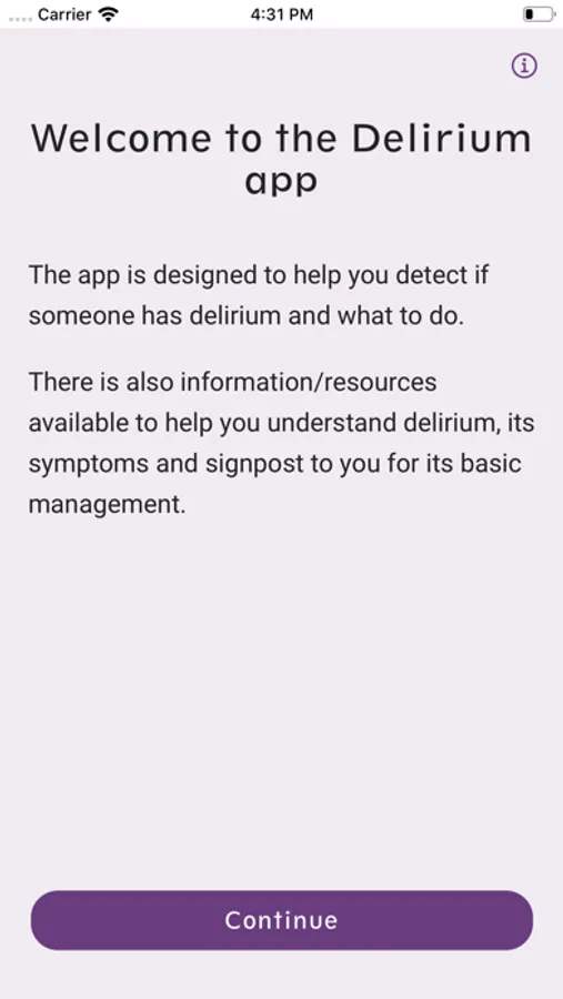 This App has been developed to support care professionals to help them detect delirium and also help them manage people suffering from Delirium by enhancing their awareness, skills and knowledge in this area.