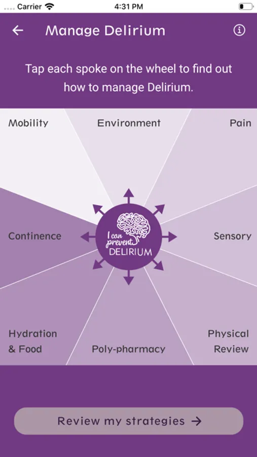 Staff will be able to use the app to detect various types of delirium and also utilise the Delirium Wheel to identify several underlying causes and create a non-pharmacological management plan to support patients suffering from delirium. Staff can access various resources through this app, including NEWS2 and 4AT, which is a validated delirium detection tool.
