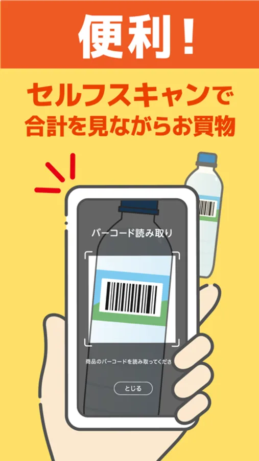 自分のスマホで商品バーコードをスキャン!お会計は画面を見せるだけでサッと完了。