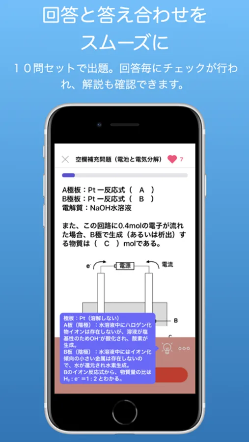 学習したい単元とクイズの種類を選択すると、1回あたりランダムに合計10問のクイズが出題されます。間違えた場合は正解するまで再度出題されるので、より記憶に残るでしょう。解説もついているので、わからない場合は解説を見て再回答できます。解説がわかりにくい場合などは改善リクエストも受け付けています。