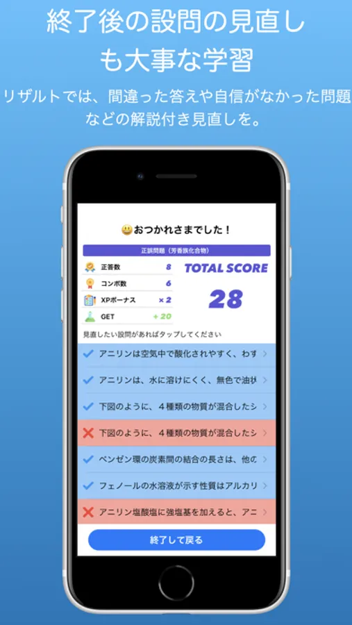 クイズ終了後には、学習経験値であるXPとともにライフを回復できるフラスコを毎回もらえます。継続学習日数が増えると、獲得フラスコ量に一定のブーストがかかります。少しずつでも、毎日の学習をキープしましょう。