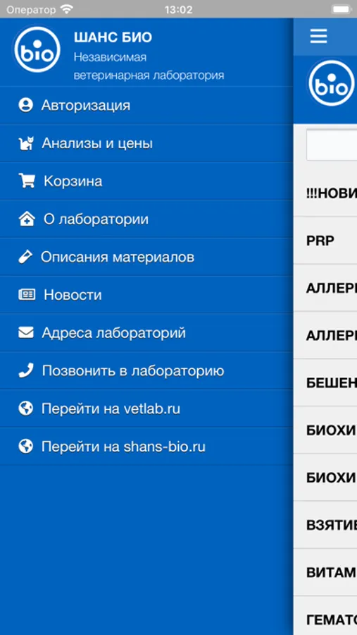 - быстрый переход на сайты лаборатории Шанс Био и ветеринарных центров Шанс Био, звонок в единую справочную из приложения;