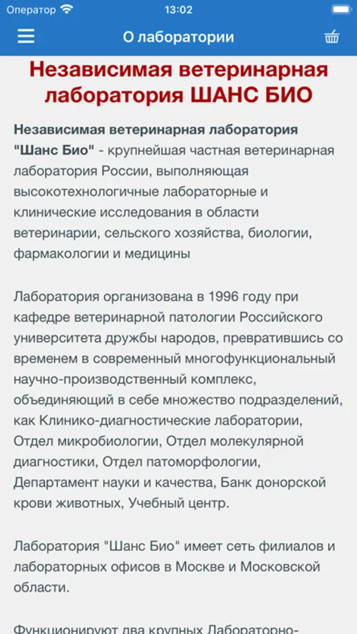 Независимая ветеринарная лаборатория "Шанс Био" - крупнейшая частная ветеринарная лаборатория России, выполняющая высокотехнологичные лабораторные и клинические исследования в области ветеринарии, сельского хозяйства, биологии, фармакологии и медицины.