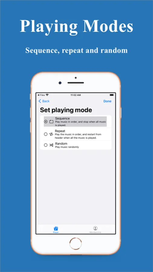 • Multiple playing modes. It supports sequence, repeat and random playing mode.