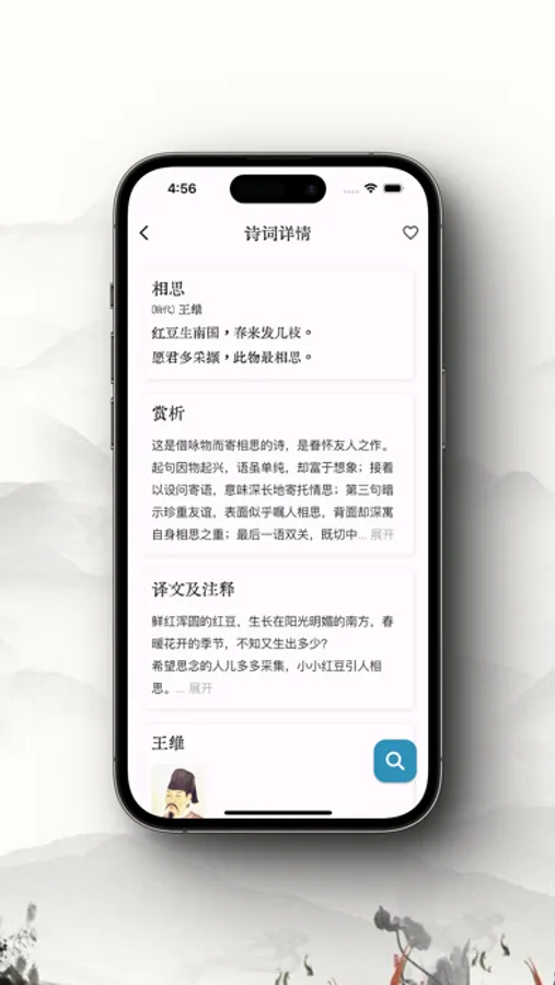 如果遇到不会阅读的字,我们提供点字注音解释的弹框,只需点击不懂的地方即可。同时还会展示笔画顺序、更多释义,让你更放心的阅读,更能够理解诗句的深意,把握其中的精髓。