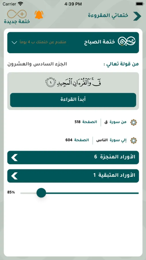 تطبيق يقوم بتحديد ورد يومي للقراء للمساهمة في نشر ثقافة قراءة القرآن الكريم والمواظبة عليها.. يقوم مستخدم التطبيق بتحديد الورد اليومي الذي يرغب فى المواصله عليها وتحديد مكان قراءة الورد " داخل التطبيق – خارجه" او الاستماع للورد او الاشتراك في مجموعات لقراءة القران بشكل منفصل او الاشتراك بختمه واحده