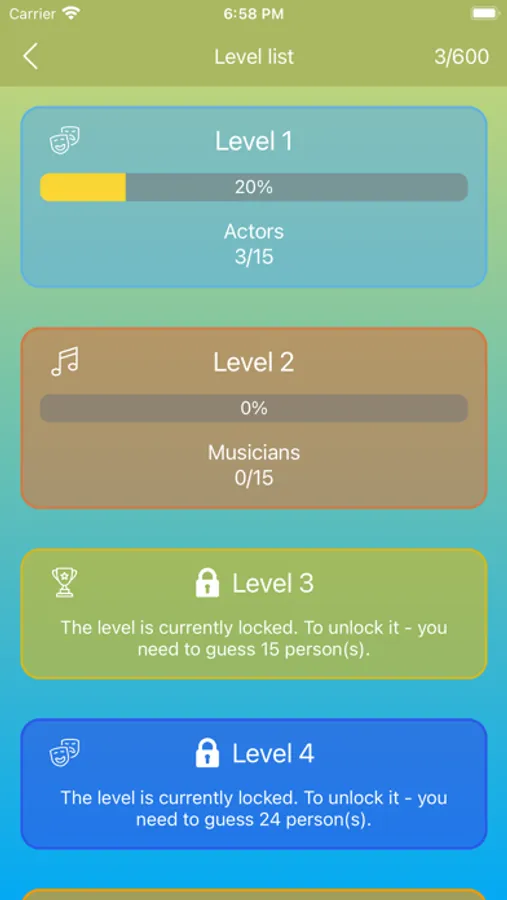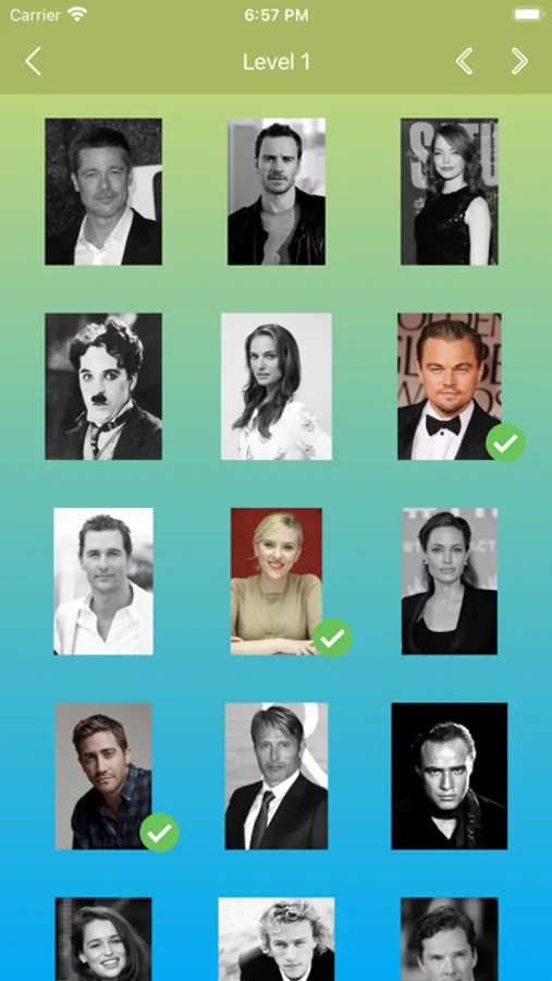 In the game there are 40 LEVELS with photographs of famous people — actors, directors, musicians (including music bands), composers, athletes, writers and artists, politicians and rulers, businessmen, scientists, etc. Each level contains one definite profession. Collect coins, use them for taking hints and complete the game 100%!