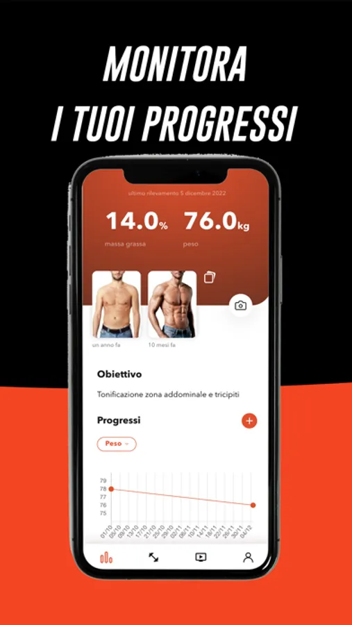 Avrai sempre sotto controllo la tua attività fisica: potrai visualizzare quali esercizi sono previsti nel tuo piano di allenamento, i tuoi progressi e come cambia il tuo fisico nel corso del tempo.