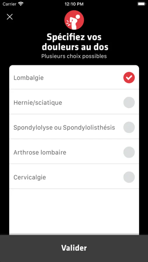 Si un exercice est incompatible avec vos douleurs, il sera signalé par un triangle rouge et des variantes vous seront proposées.
