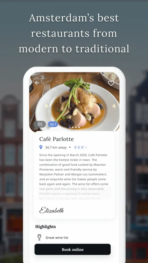 Each recommendation comes with an introduction and tips by Elizabeth, photos, opening hours, social media links, directions and tools to book easily from your phone
