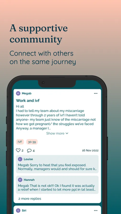 Connect with others in our community. Find others who are doing the same fertility treatment as you or just share your feelings with others who understand what you are going through.