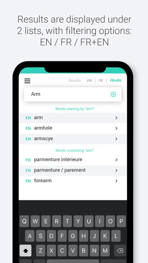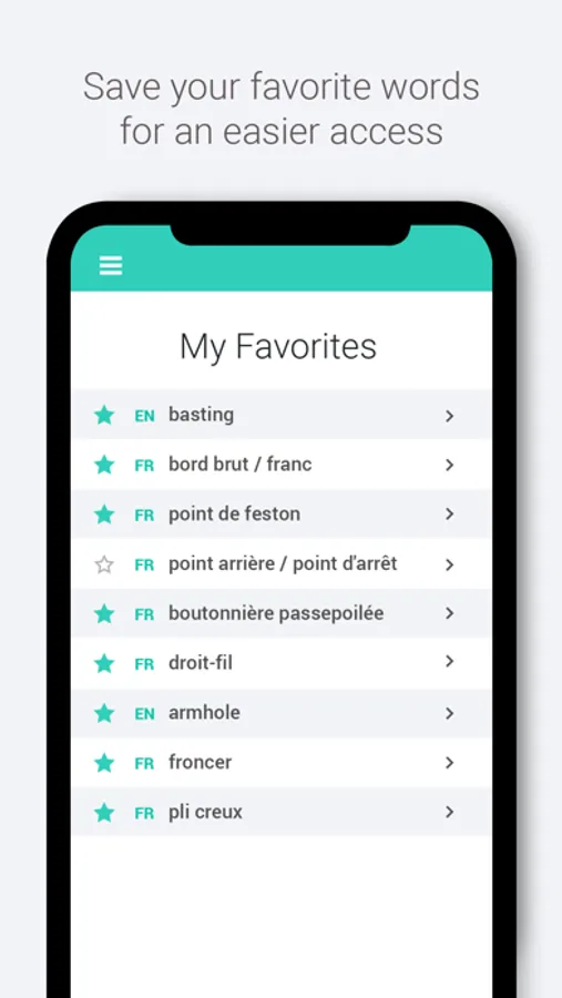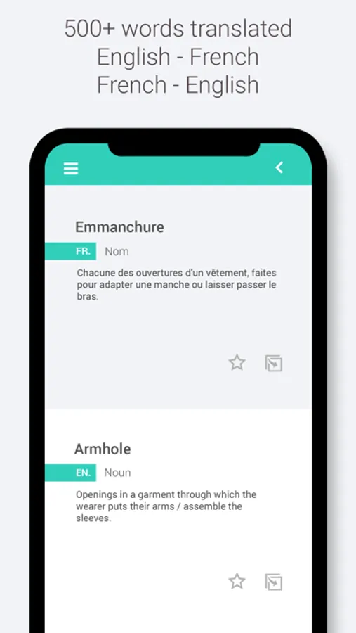 This bilingual dictionary application contains 500+ sewing words translated from English to French and from French to English. A majority of the words already have a definition. We are currently working on adding more translated terms and definitions. In addition, you do have a form in the app to suggest new words to us.