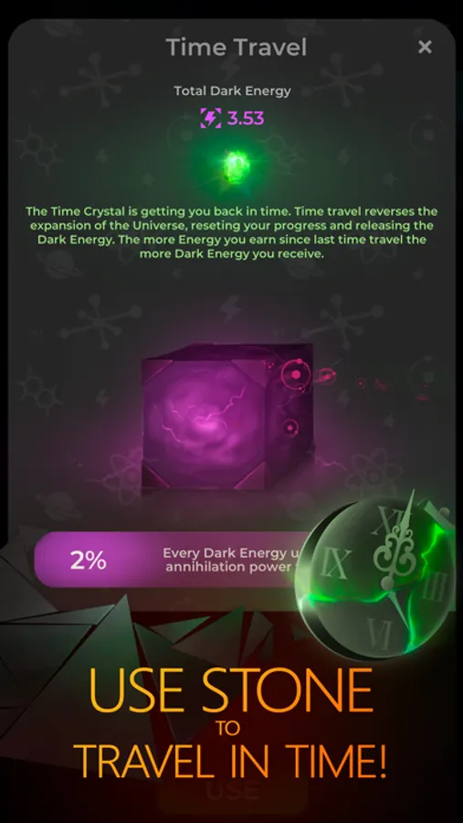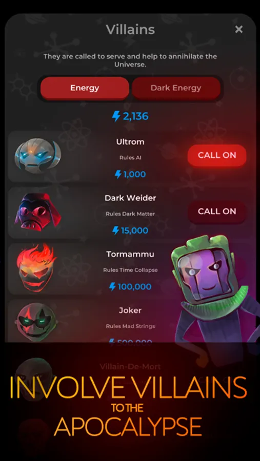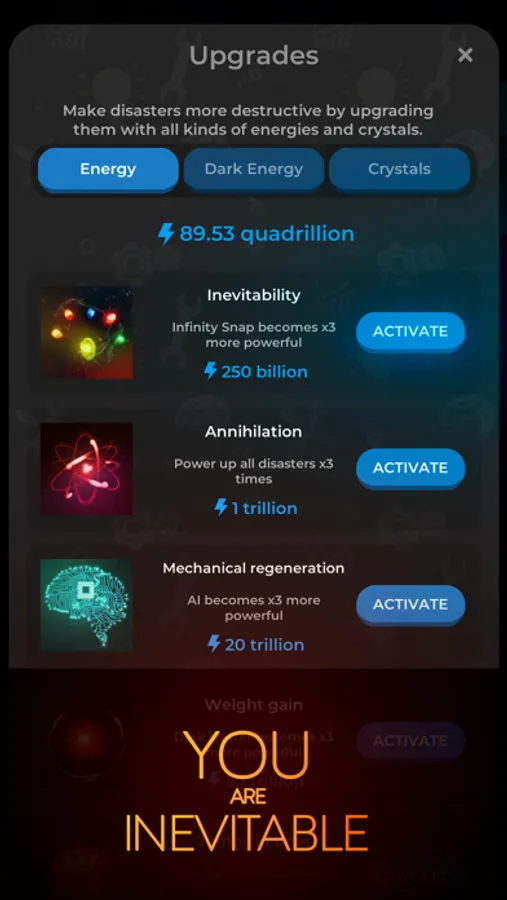 This is an incremental idle clicker game where you will earn two types of energy - regular Energy and Dark Energy, explore universes in the whole Multiverse, annihilate every atom, and upgrade Disasters. New adventure is waiting for you.