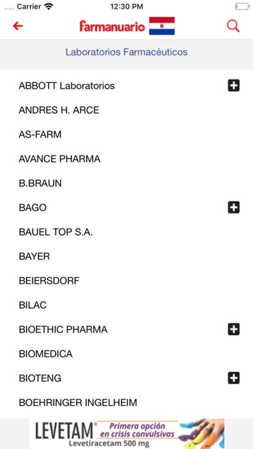 Farmanuario Vademécum Móvil presenta adicionalmente un Indice de Empresas Farmacéuticas donde se describen los Productos de cada Laboratorio
