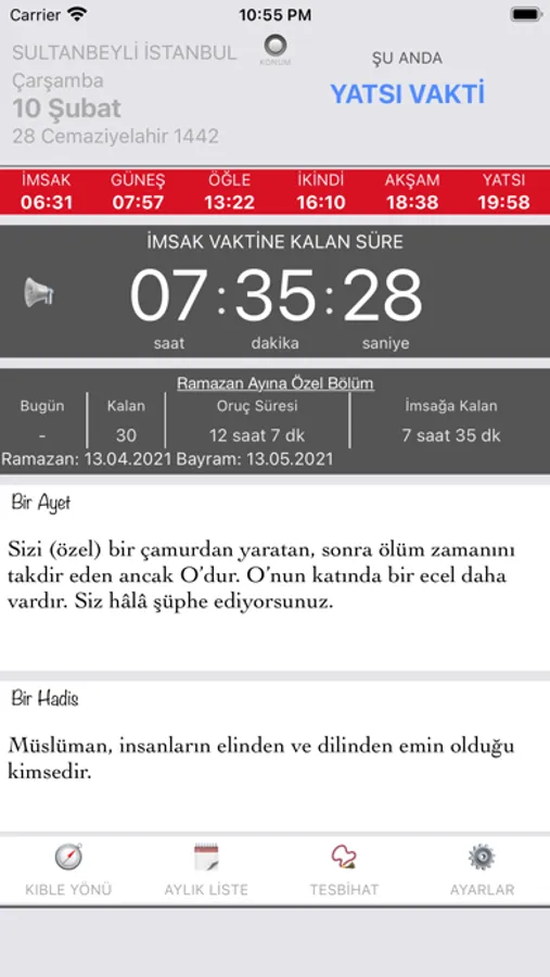 Ramazan imsakiyesi olarak kullanabileceğiniz uygulamamızda Ramazan ayı için özel olarak ayarlanmış bir bölüm daha bulunmaktadır. Buradan iftar ve imsak vakitlerini, oruç tutma süresini, kaç gün geçip kaç gün kaldığını vb. görebilirsiniz. Bu bölümü ayarlar ekranından açıp kapatabilirsiniz.