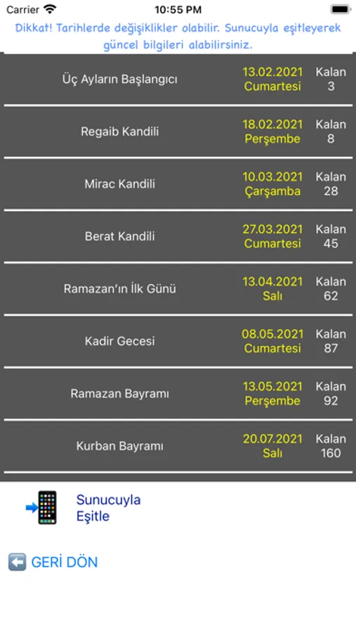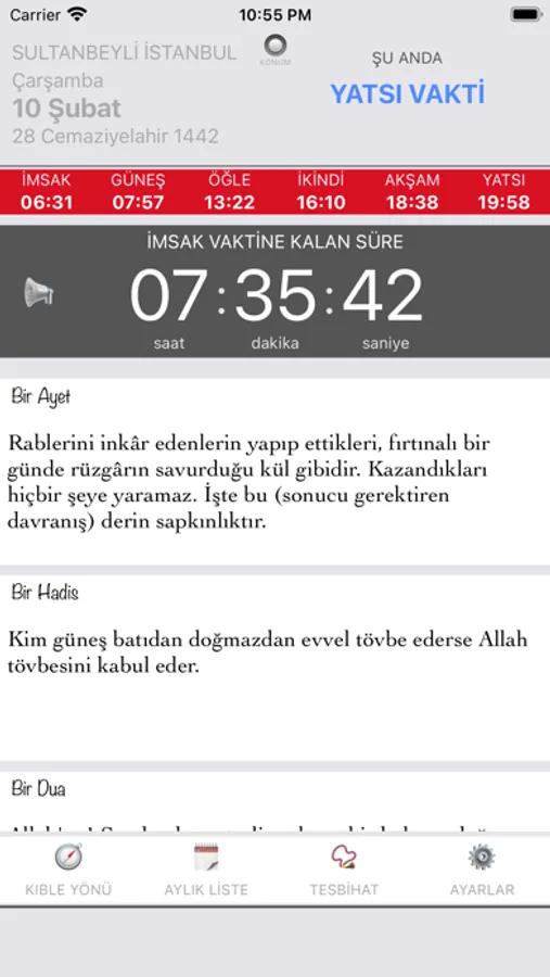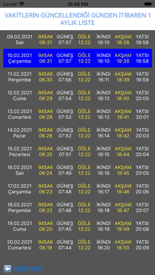 Diyanete uygun olarak alınan ezan vakitleri, çok sade ve modern bir arayüz ile sunulmaktadır. Göz yormayan ve kolay anlaşılır bir ekran ile namaz vakitlerini kolayca takip edebilecek ve tam zamanında bildirim alabileceksiniz.
