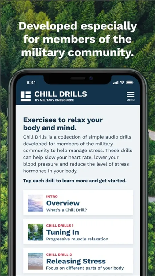 Chill Drills by Military OneSource is part of a family of apps from the Defense Department and Military Community and Family Policy. These apps support service members from the Army, Navy, Marine Corps, Air Force, Coast Guard, National Guard and Reserves, their spouses, immediate family members, survivors and other members of the military community.