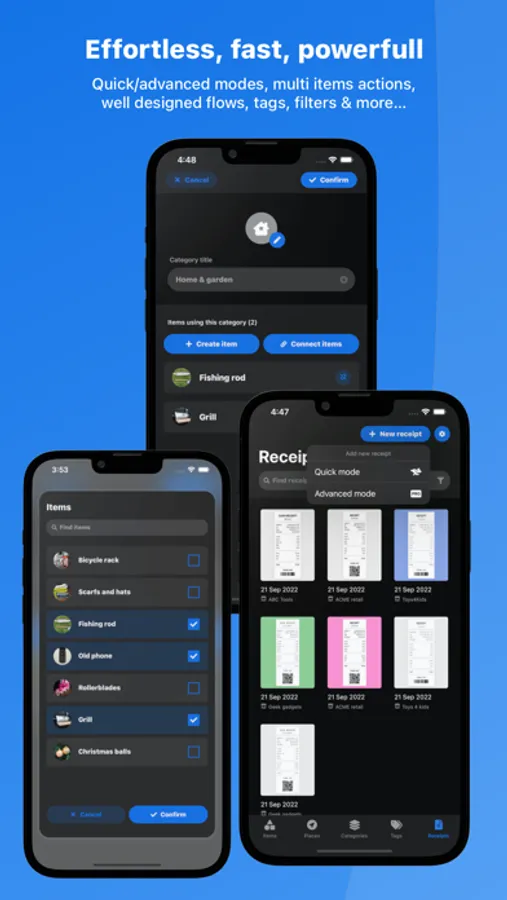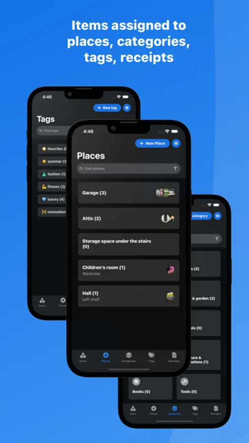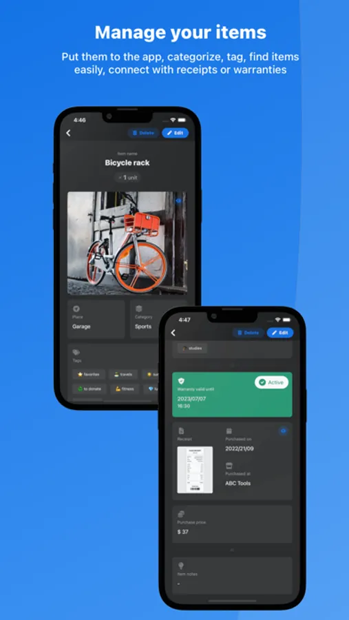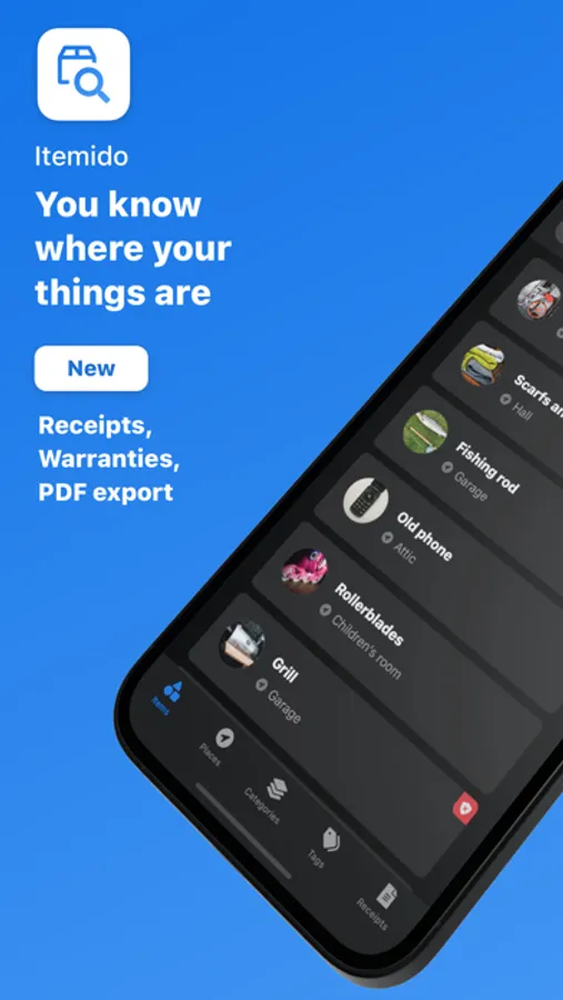 Connect items to categories or tags - to find and manage them easily. Use the app from any Apple device you own. Store the data locally or using Apple iCloud (for sync with other devices and for backup). Without any need of registration. With single, one time, fair payment (no in-app purchases, no subscriptions).