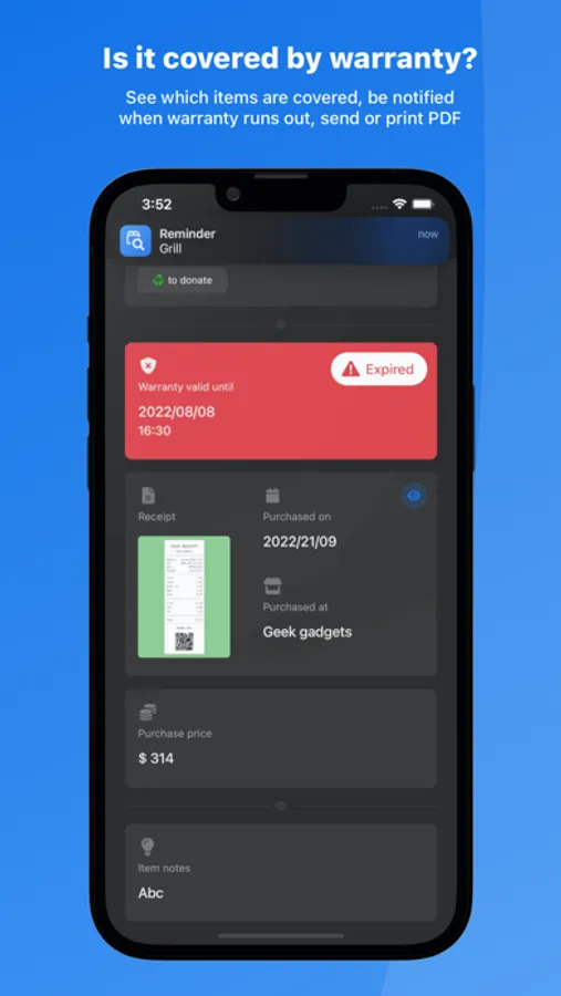 - when the item will be broken or faulty - use the app to check when you purchased it (e.g. to call for support), show or send the receipt to prove you purchased it