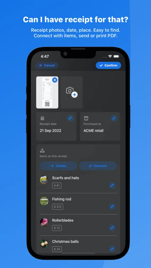 Manage your items. Create a database with details of each item (where is it, is it covered by a warranty, where and when was it purchased, scan of receipt/invoice). Be notified when warranty ends.