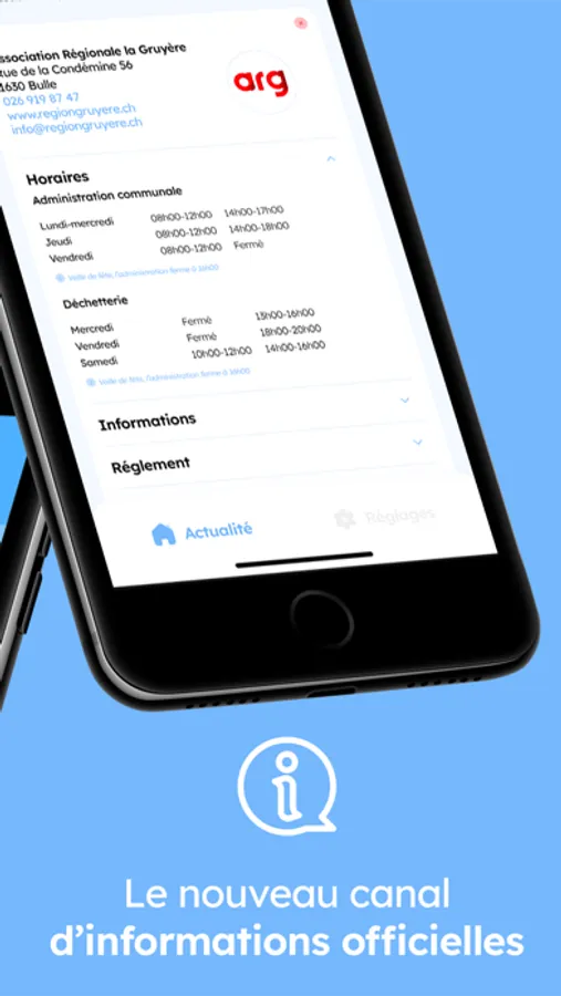 Simple et rapide, cette application permet d’informer en temps réel sur des sujets d’actualité communales. Fermeture exceptionnelle d’une route, d’un parking, changement d’horaire de la déchetterie, interdiction de faire des feux de forêts et bien plus encore ! En tout temps, vous serez informé/e par notification. Plus besoin de rechercher l’information, elle vient à vous! Chaque commune et institution dispose de son propre canal de diffusion que vous pouvez ajouter à votre liste de canaux favoris.