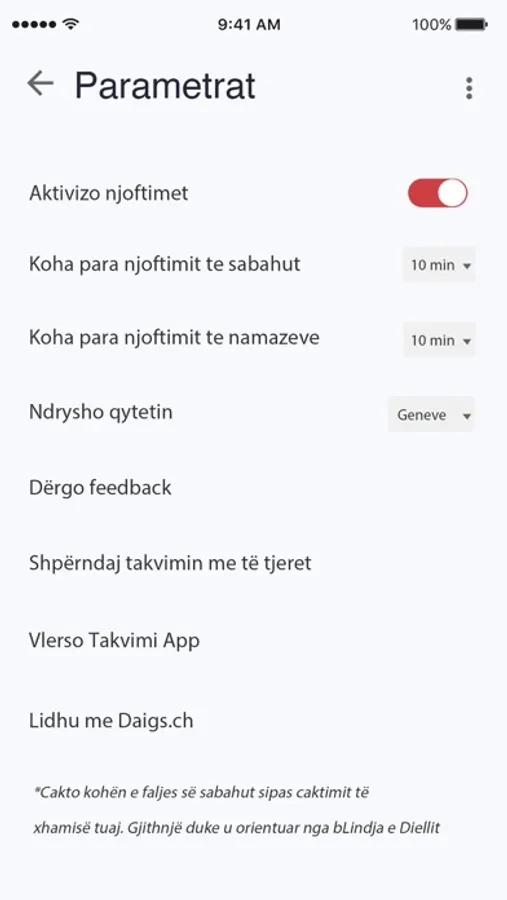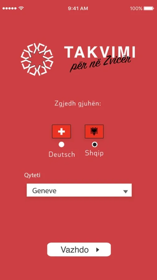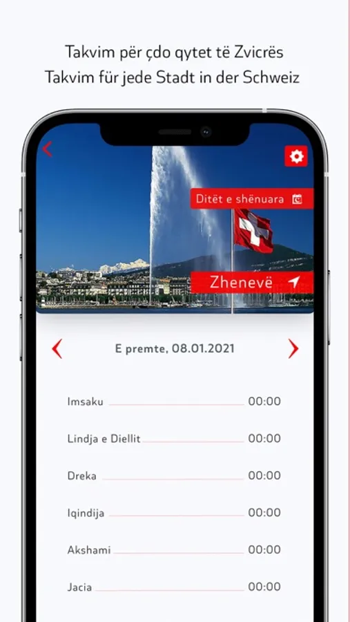 Takvimi për në Zvicër furnizohet sipas kalkulimeve tona të sakta kohore, për të gjitha qytetet e Zvicrës. Ka të integruar edhe sistemin Push Notification, ju njofton paraprakisht per secilin namaz, si dhe është në dy gjuhë: shqipe dhe gjermane.