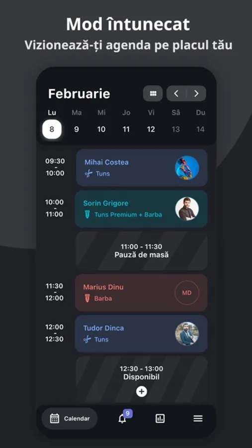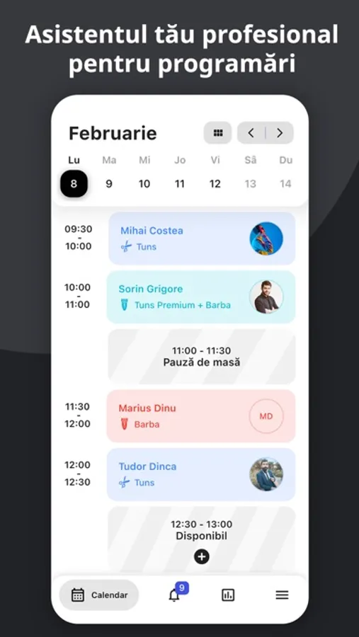 - Clienții sunt anunțați mereu să se prezinte la programare, prin notificări. Tu decizi cu cât timp înainte.