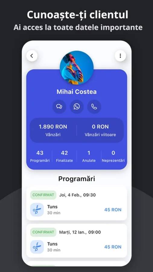 - Profil extins pentru fiecare client, cu istoric complet.