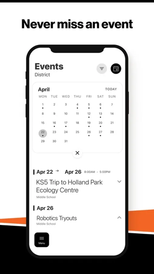 The event section shows a list of events throughout the district. Users can add an event to your calendar to share the event with friends and family with one tap.