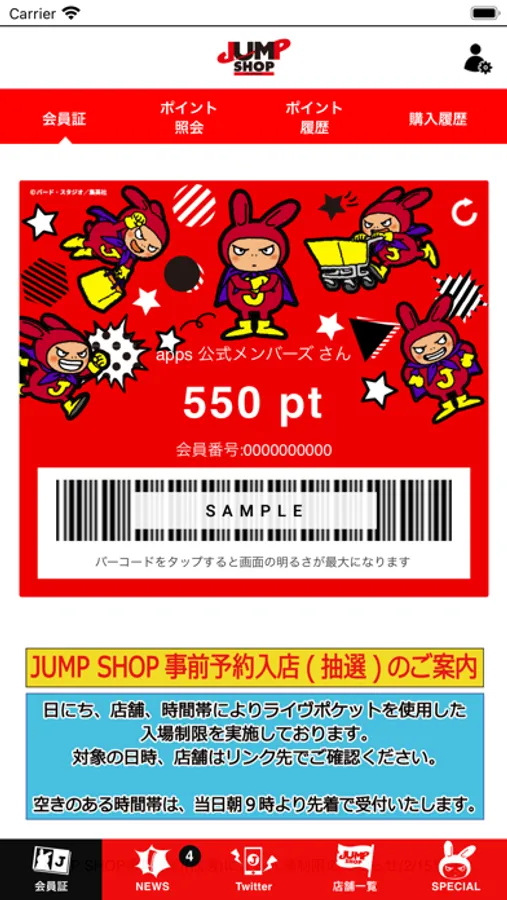 「JUMP SHOP」アプリを使用して、対象店舗にてご購入の際にポイントを貯める事ができます。