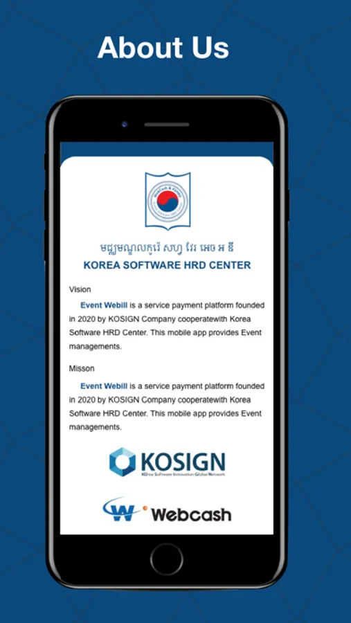 EventWebill is one of the mobile applications in Cambodia which is created by Korea Software HRD Center. The purpose of this mobile application is to provide a preferable way for admin in managing events and user's information.Besides, EventWeBill also provides a contented way for the user to stay reminding of the upcoming event. Moreover, EventWeBill Integrated with WeBill in Kosign that cooperated with Wing agency to help user pay the bill to the event.