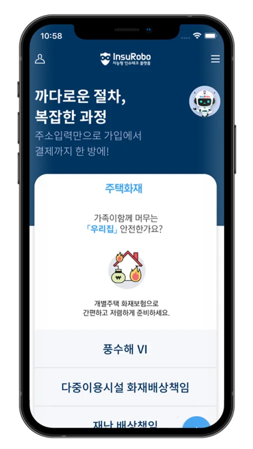 인슈로보는 사용자의 경험 데이터를 기반으로 쉽고, 빠르고, 편리하게 보험가입할 수 있도록 정보입력을 최소화하여 간편하게 이용가능 하도록 하였습니다.