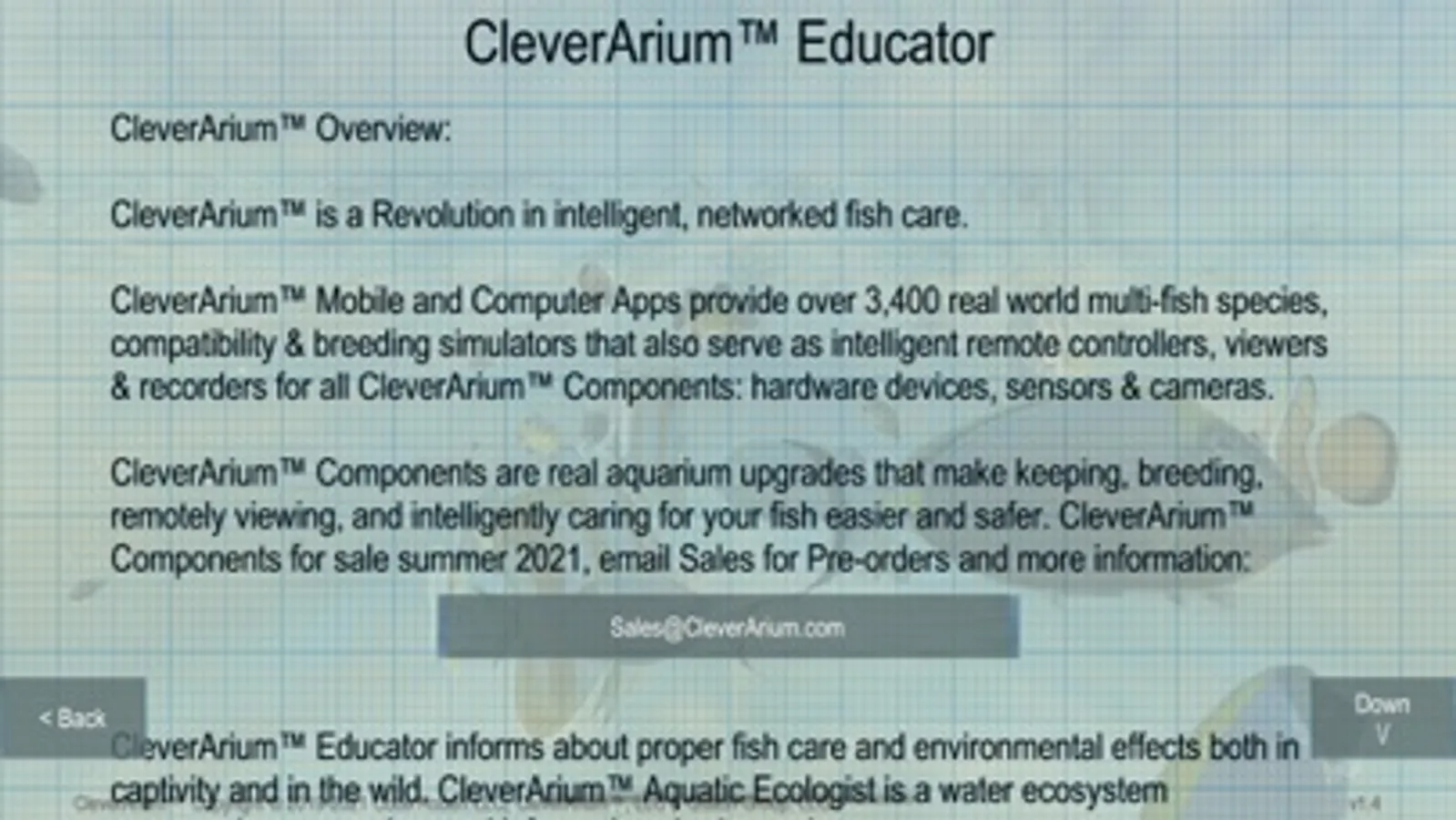 CleverArium™ Educator informs about proper fish care and environmental effects both in captivity and in the wild. CleverArium™ Aquatic Ecologist is a water ecosystem preservation, protection, and information sharing tool.