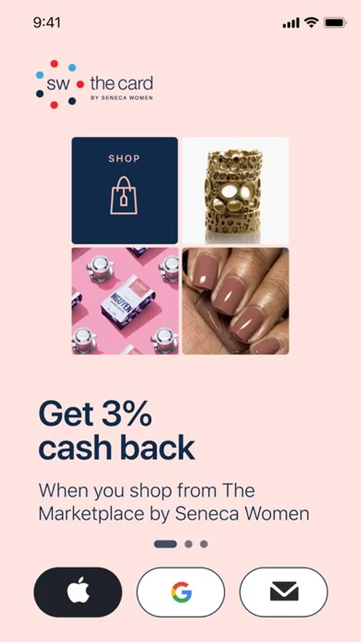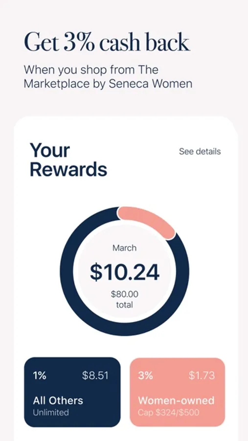 The Card by Seneca Women is the world’s first credit card that pays you 3% cash back when you shop from women-owned businesses in The Marketplace by Seneca Women.
