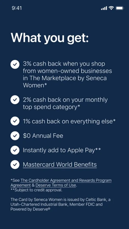 The Card by Seneca Women (“The Card”) is issued by Celtic Bank, a Utah-Chartered Industrial Bank, Member FDIC and Powered by Deserve, Inc.
