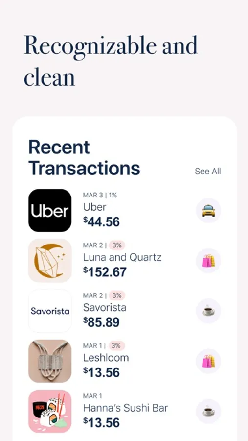 See how each purchase affects your overall category spend for the month as well as the history of your spend with this merchant. If you added a tip, you’ll see a red heart next to it. Now you can understand and get the full context of all your spending habits.