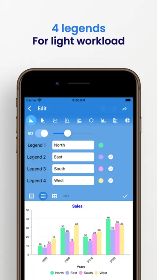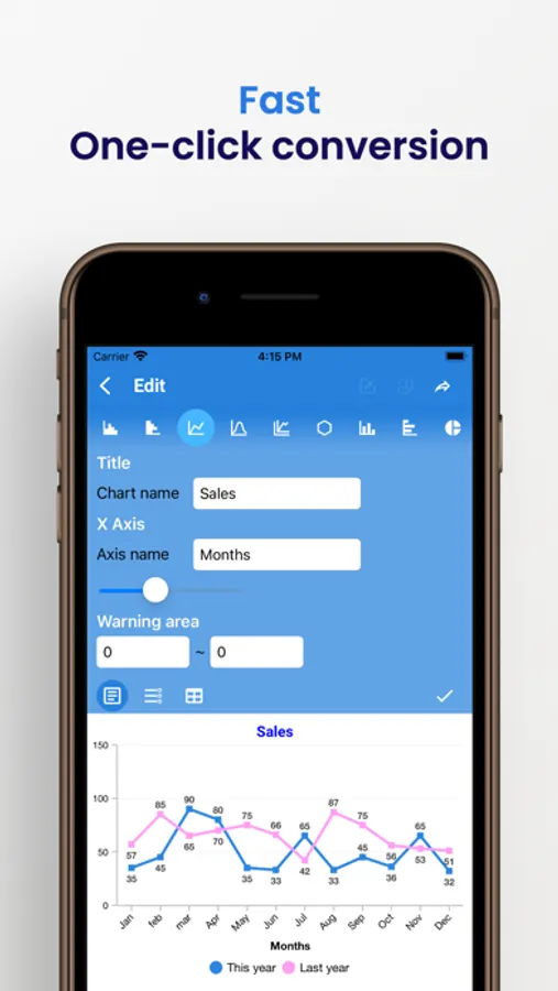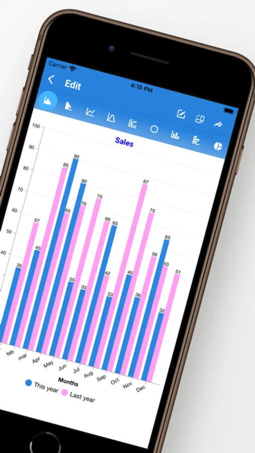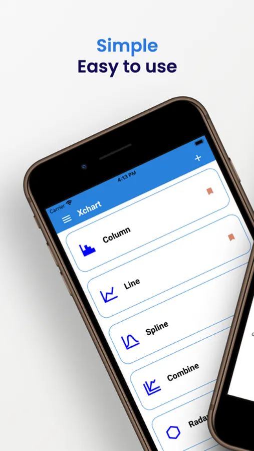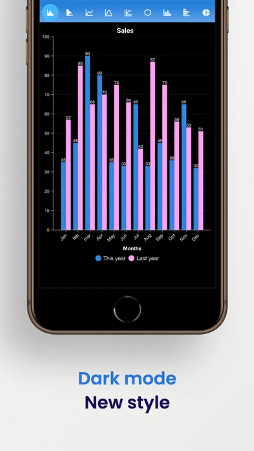 Column chart, line chart, spline chart, pie chart, doughnut chart, radar chart, pyramid chart.