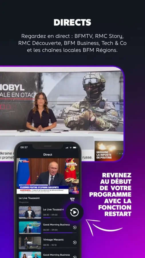 • TV EN DIRECT : Avec le Direct, accédez en un clic au LIVE de toutes les chaînes RMC BFM et avec le Restart revenez au début de votre programme et revivez les grands évènements du direct.