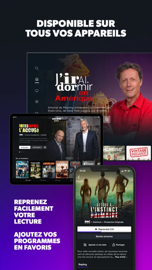 • REPLAY : Disponible juste après la diffusion ou en avant-première, retrouvez tous vos contenus préférés à la demande ! Naviguez et faites votre choix parmi un catalogue riche de milliers de vidéos disponibles entre 7 et 30 jours, facile à trouver dans la rubrique derniers replay. Chaque programme bénéficie également d'un enrichissement éditorial complet (bandes annonces, bonus vidéo, photos, fiches personnalités...).