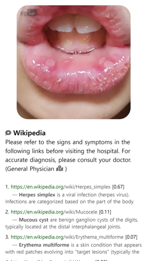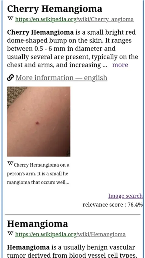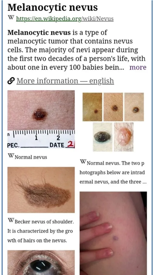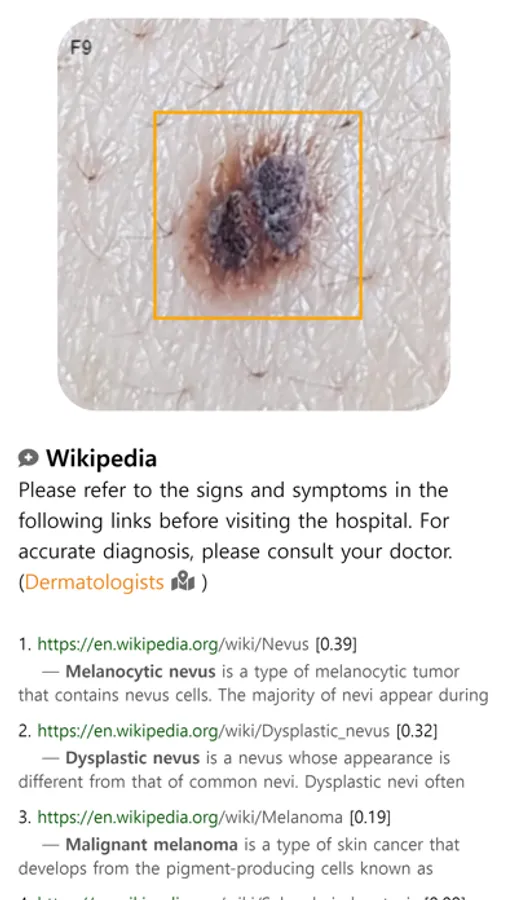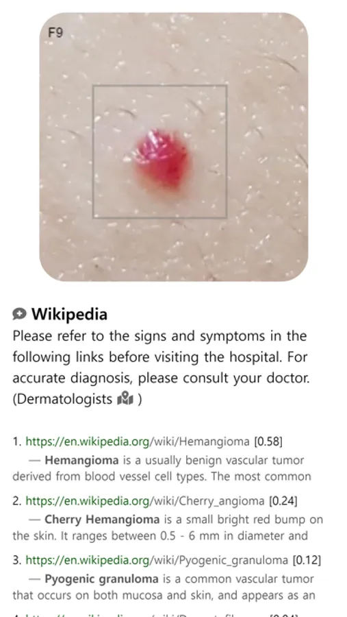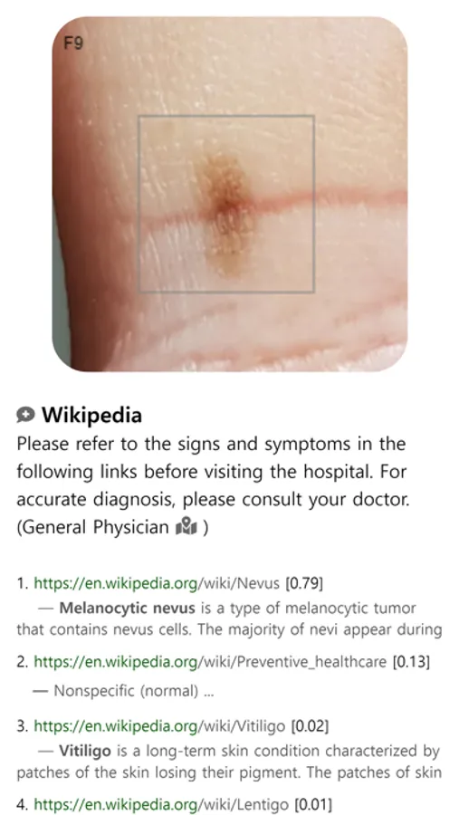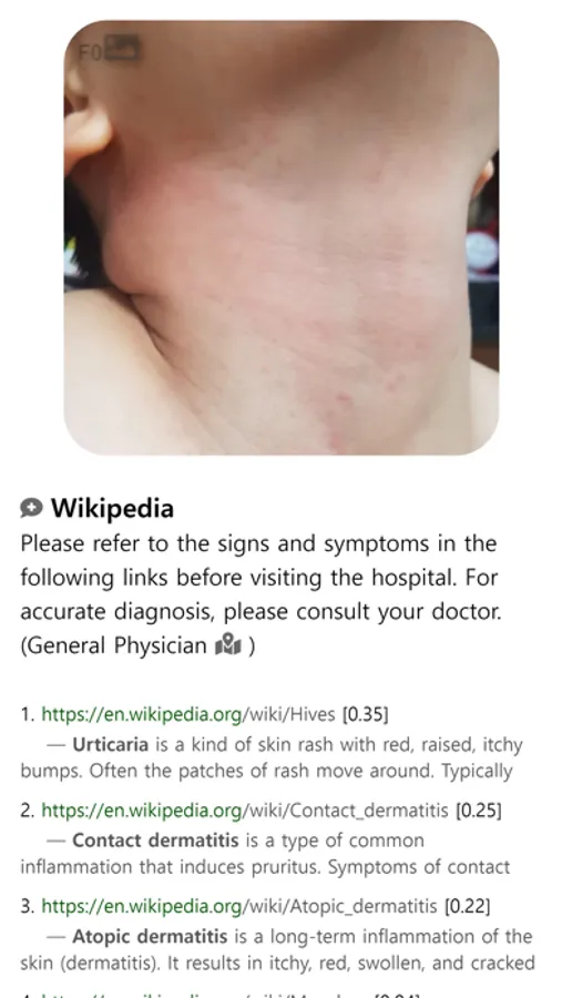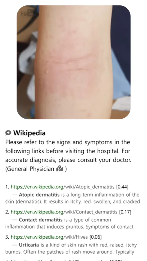 Artificial intelligence can analyze the provided photograph and instantly help to find medical information for your skin problem. The algorithm offers relevant medical information on skin diseases such as skin rash, wart, and hive.