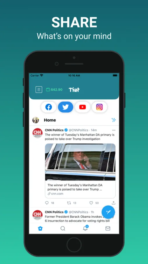 Everyone knows how frustrating it is to see a post on twitter… then have to screenshot it…. then exit out of twitter… to then log on to Facebook and post it… then exit out of Facebook… to then log back on to twitter. Do it all from one platform with TIZR!
