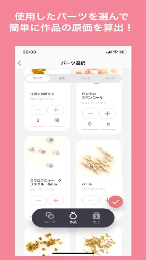 事前に情報を登録しておいたパーツより、使ったパーツ・数量をピックアップしていくだけで、その作品を構成するパーツを抽出・記録することが出来ます。またそれらパーツの合計金額も自動計算されるので、原価がすぐにわかります。