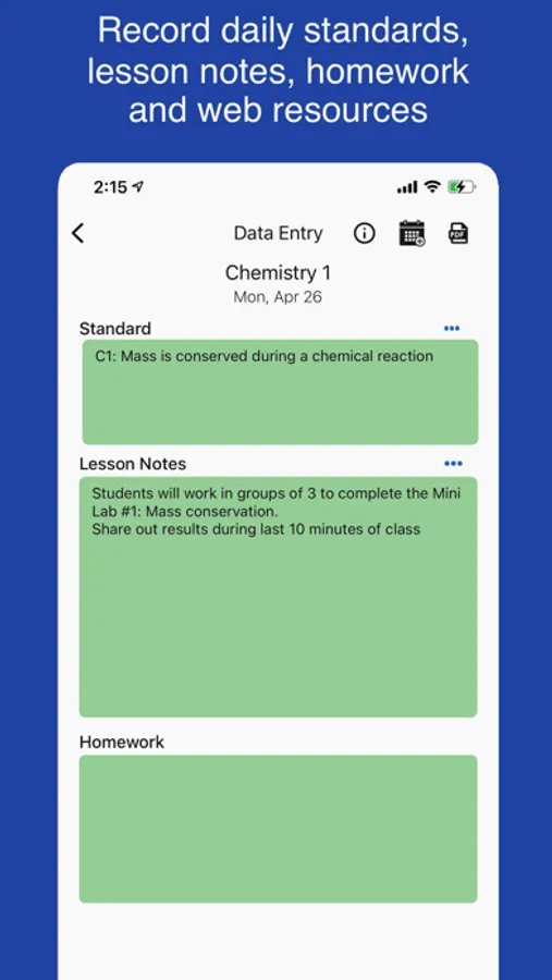 Class Planner allows teachers to easily keep a record of their lesson plans which include the standards, lesson notes, homework and an online web resources.