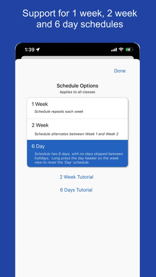 • Support a 1 week, 2 weeks or 6 day schedule.