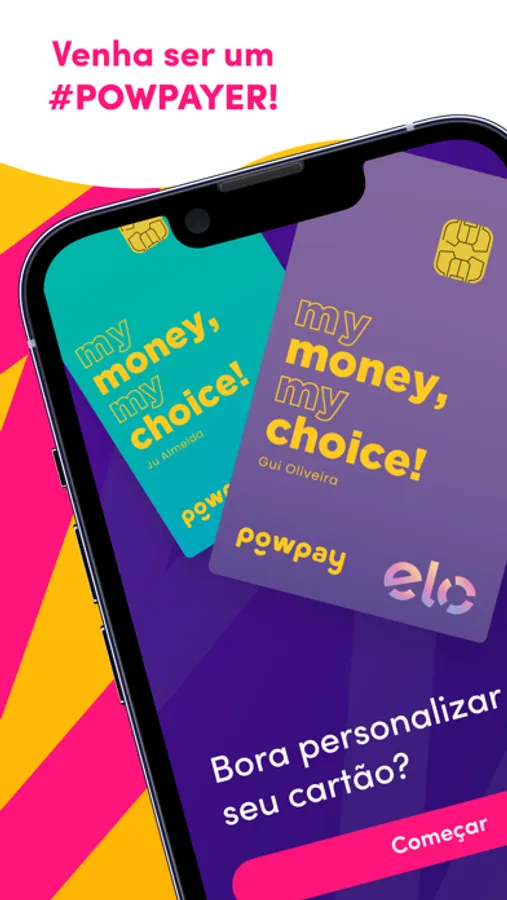 É só pedir o cartão pelo aplicativo! O Cartão Powpay é pré-pago, aceito em todo o Brasil, e pode ser usado em compras físicas ou online. Além de ter muito estilo e opções de personalização!