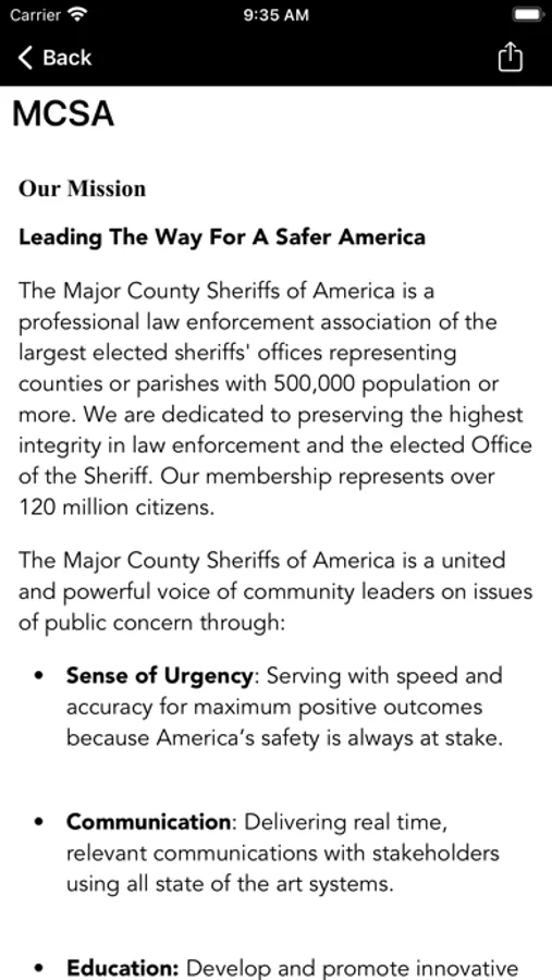 The Major County Sheriffs of America mobile application is an interactive app developed to help improve communication with current MCSA Members and the citizens of their Sheriff’s Office. The MCSA App allows MCSA Members to connect quickly to the MCSA to become a member, support MCSA initiatives, and other interactive features, as well as providing the community the latest public safety news and information.