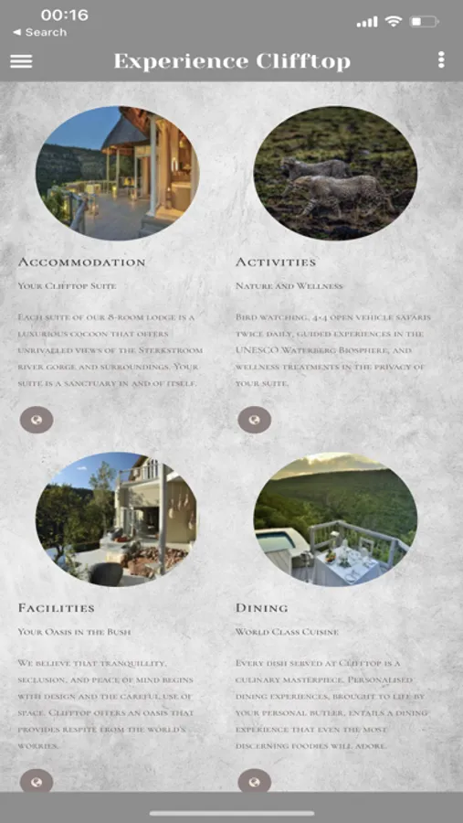 The Clifftop Lodge App is your digital companion at Clifftop Exclusive Safari Hideaway. Plan your journey with us in advance by using our bookings feature. Arrive at the Lodge in style by completing our contactless check–in forms that allow you to seamlessly begin your indulgent retreat. From pre–booking your wellness treatments to making use of our in–app exercise routines, the Clifftop Lodge App has been purpose–built to enrich your experience with us. Take your safari experience to the next level with our digital species checklists that allow you to keep a record of all the species that you get to spot during your adventures around the UNESCO Waterberg Biosphere inside Welgevonden Private Game Reserve. Create lasting bonds with Clifftop, and enjoy the various benefits of joining the Clifftop community. Travel better with Clifftop Exclusive Safari Hideaway.